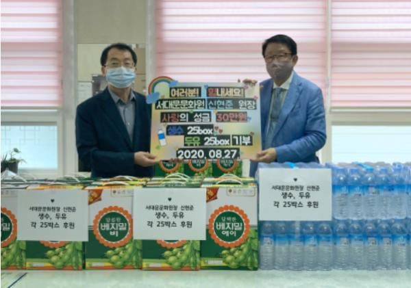 서울특별시 서대문구 홍은2동(동장 황치문)은 신현준 서대문문화원장이 코로나19로 어려움에 처한 이웃을 위해 써달라며 최근 성금 30만 원을 기부하고 저소득 가정에 생수와 두유 각 25박스도 전달했다고 31일 밝혔다.