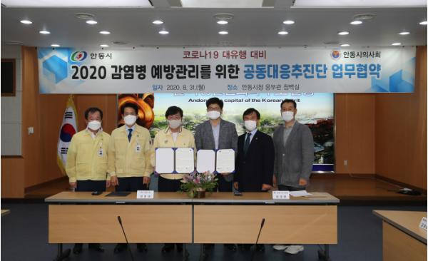 안동시(시장 권영세)와 안동시의사회(회장 최영환)는 8월 31일(월) 안동시청 웅부관 청백실에서 코로나19 등 신종 감염병 유행에 효과적으로 대처하기 위해 공동대응추진을 위한 협약식을 가졌다.