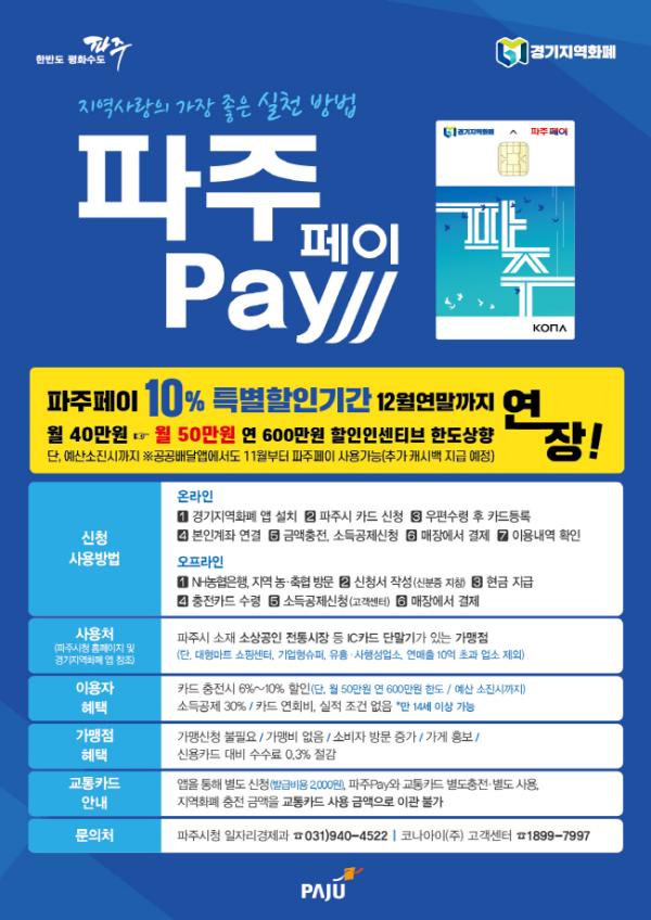 이는 추석이 다가고 있고 10월 말, 공공배달앱 시범서비스가 개시됨에 따라 지역화폐 충전 한도를 상향해 지역 골목상권, 전통시장에서의 소비를 확대하기 위함이다. 공공배달앱에서도 11월부터 파주페이가 온라인으로 사용가능하고 5% 캐시백이 지급될 예정이다.