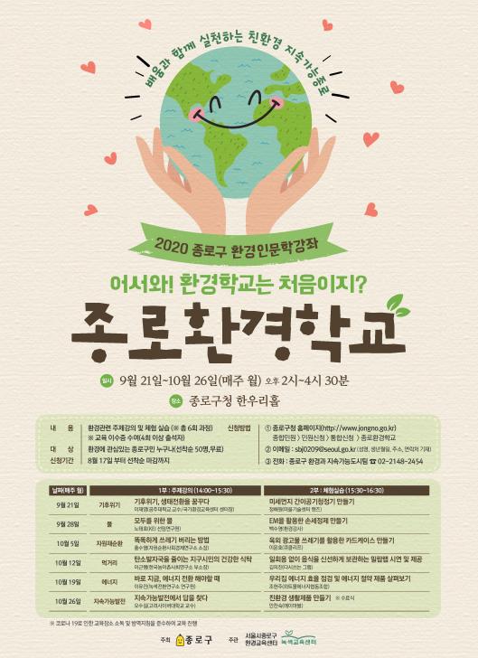 먼저 강의, 체험, 실습을 연계한 종합 환경교육 프로그램 「종로환경학교」 는 9월 21일부터 10월 26일까지 매주 월요일 오후 2시에 구청 한우리홀에서 열린다. 총 6회 과정으로 환경에 관심 있는 주민 누구나 참여할 수 있으며 ▲기후위기 ▲물 ▲자원재순환 ▲먹거리 ▲에너지 ▲지속가능발전 등을 주제로 하여 1부 주제강의와 2부 체험실습 순으로 진행한다.