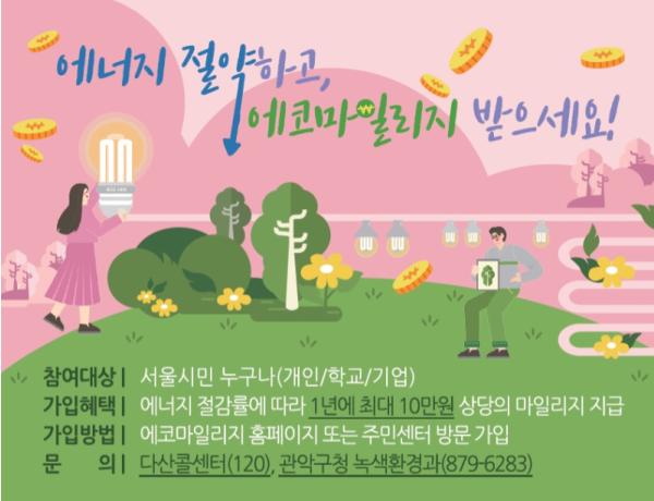 관악구(구청장 박준희)는 가정의 에너지 사용량을 절약하면서 적립된 마일리지로 다양한 혜택을 누릴 수 있는 에코마일리지 신규 회원을 모집한다.