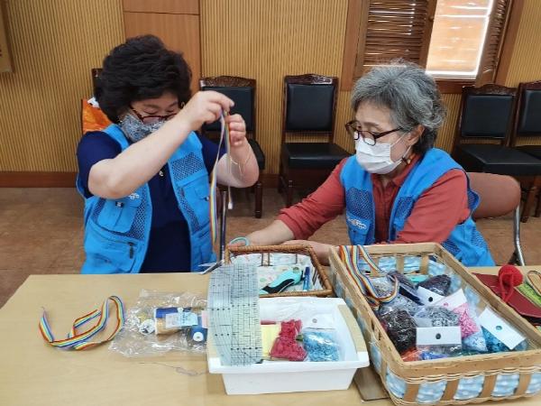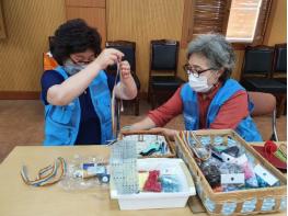 이번 마스크 목걸이 제작에는 완주군 13개 읍.면지역의 행복나눔봉사단이 참여하여 사회적 거리두기로 1일 5명 내외씩 나누어 진행한다.
