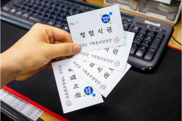 ‘청렴식권제’란 직원들이 사업 관계자와의 업무협의를 불가피하게 중식시간까지 이어서 해야 할 경우 기획홍보담당관실에서 배부하는 식권으로 군청 구내식당을 이용할 수 있도록 돕는 제도다.