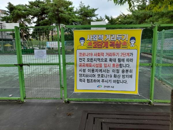 천안시는 지난 8월 말 코로나19 사회적 거리두기 2단계 상향 대응조치로 공원 내 공공체육시설을 임시 폐쇄했다.
