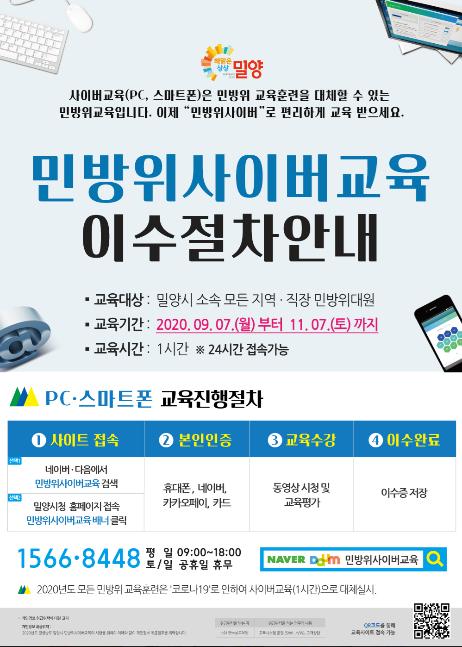 사이버 교육 수강방법은 컴퓨터나 스마트폰으로 인터넷 포털 또는 밀양시 홈페이지를 통해 “민방위 사이버교육센터(http://www.cmes.or.kr)”에 접속해 민방위 사이버교육 1시간 수강 후 과목별 평가문제를 풀어 평가점수 70점 이상이 되면 교육이수 처리된다.