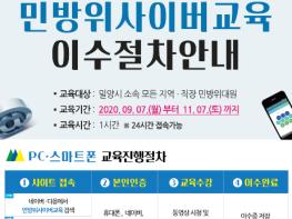 밀양시는 코로나19 감염증의 확산을 방지하기 위해 기존에 집합?대면교육을 하던 것을 비대면 교육 방식으로 전환해 민방위대원 1~4년차를 포함한 전체 밀양시 민방위대원을 대상으로 9월 7일부터 11월 7일까지 PC?모바일을 통한 민방위 사이버교육을 실시할 예정이라고 전했다.