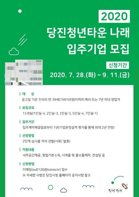 충남 당진시는 전국의 만 39세 이하의 청년창업가를 대상으로 당진청년타운에 입주할 15개의 청년창업기업을 추가 모집한다고 밝혔다.