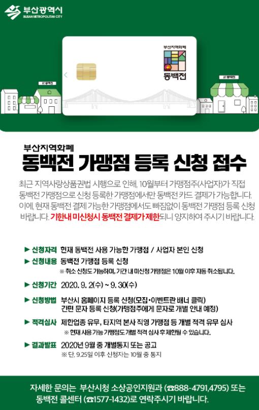 부산지역화폐 ‘동백전’이 오는 10월부터 『지역사랑상품권 이용 활성화에 관한 법률』의 적용을 받아 가맹점주(사업자)가 직접 등록 신청한 가맹점만 결제가 이루어짐에 따라, 부산시가 동백전 가맹점 등록 신청 접수에 나섰다.