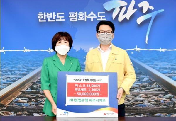 권순옥 NH농협은행 파주시지부장은 지난 1일 파주시청을 방문해 코로나19로 어려움을 겪고 있는 취약계층을 위해 써달라며 5천만 원 상당의 마스크 44,500매, 방호세트 1,300개를 전달했다.
