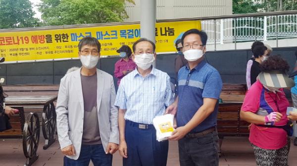 의왕시 부곡동 주민자치위원회(위원장 박경록)는 1일 부곡동 65세 이상 어르신과 기초생활수급자를 대상으로 부곡동 주민센터 앞에서 2,000여개의 마스크와 마스크 목걸이 나눔 행사를 진행했다.