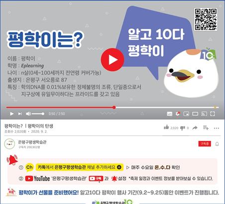 <알고10다 평.학.이.>는 『은평구평생학습관 온라인 공감한데이』의 줄임말로 대중에게 평생학습을 친근하게 전달하기 위해 고안한 조류 캐릭터인 ‘평학이’가 학습관에 얽힌 이야기를 영상으로 소개하고, 온라인 이벤트를 통해 축제 참여 기회를 제공하는 비대면 행사이다.