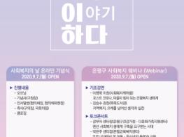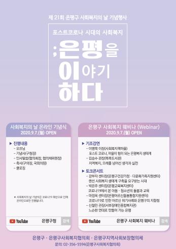 은평구(구청장 김미경)는 오는 9월 7일 『제21회 사회복지의 날 기념행사』를 온라인으로 개최한다고 밝혔다.