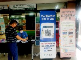 군청을 방문하는 고객은 스마트폰을 통해 일회용 개인 QR코드를 발급받아 전자출입명부 단말기에 스캔해야 출입을 할 수 있으며 스마트폰이 없거나 사용이 익숙하지 않는 분들은 기존대로 수기로 출입명부를 작성하여 출입하면 된다.