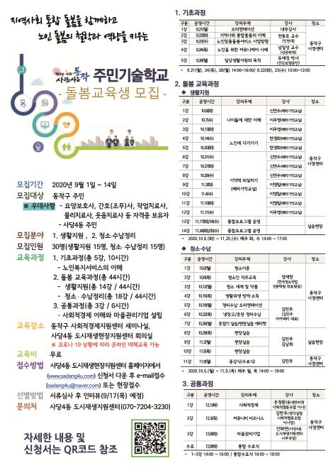 사업대상지는 사당4동 도시재생지역과 상도3?4동 주거밀집지역으로, 지역 특성을 반영한 ▲돌봄분야의 생활지원 코디네이터 양성과정과 ▲주거분야의 우리집 그린케어 주거 인력양성 과정으로 진행된다.