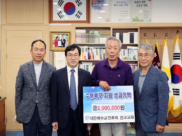 이어 대한예수교장로회 진교교회(목사 권동진)도 군수 집무실을 방문해 200만원을 기탁했으며, 국제라이온스협회 354-D(서울)지구(총재 양주환)는 1000만원을 보내왔다.