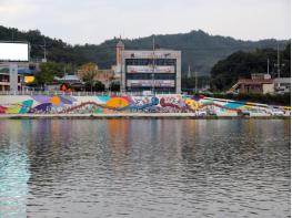 장흥군을 가로지르는 탐진강가로 형형색색의 장흥고싸움 벽화가 그려져 눈길을 끌고 있다.