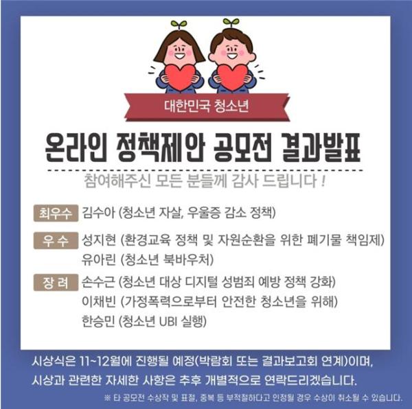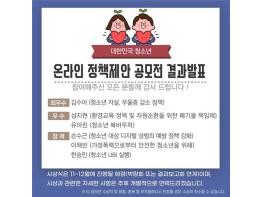 제안된 정책은 공감댓글 순에 의한 1차 합격자 선발, 2차 정책제안 영상 시청 및 투표를 통해 최종 수상자로 결정되었다. 시상식은 11~12월에 열리는 대한민국 청소년박람회에서 진행될 예정이다.
