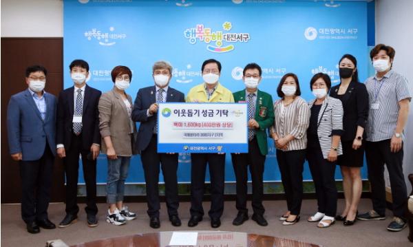 대전 서구(구청장 장종태)는 28일 청사 갑천누리실에서 국제로타리3680지구 2지역 회장단(지역대표 배한모)으로부터 백미 1,600kg(400만 원 상당)을 기탁받았다.
