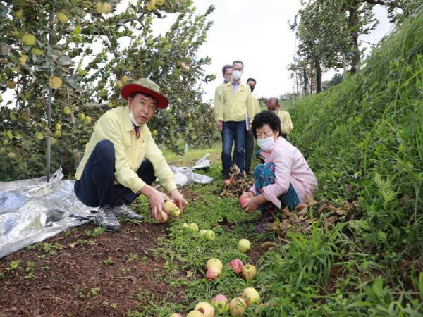 3일 오전 김철우 보성군수가 제9호 태풍 ‘마이삭’으로 낙과 피해가 발생한 겸백면 과수 농가를 찾아 피해 상황을 점검하고 농가를 위로했다.