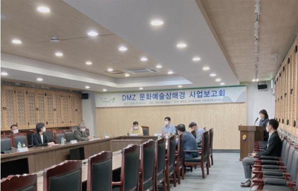 연천군(김광철 군수)은 지난 2일 연천군청 상황실에서 ‘2020년 연천군 DMZ문화예술 삼매경 사업 기본구상용역 보고회’를 개최했다고 밝혔다. 이날 보고회에는 김광철 연천군수를 비롯해 박성남 부군수, 김병준 문화복지국장, 이종민 관광과장 그리고 용역사인 이로재 건축사사무소 승효상 건축가 및 김성희 소장 등이 참여했다.