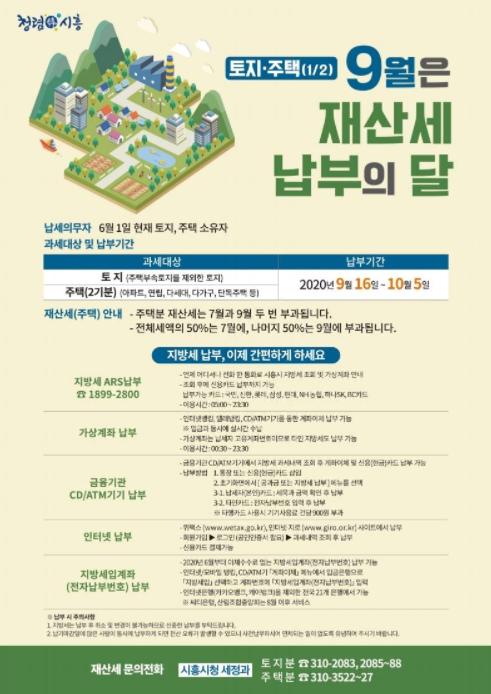 9월 정기분 재산세에 대한 기타 문의사항은 시흥시청 세정과(031-310-2082)로 토지분은 재산세팀(031-310-2082, 2085~88)으로 주택분은(031-310- 3522~27)으로 문의하면 된다.