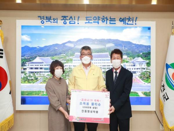 예천군(군수 김학동)은 안동명성약품 박준섭 대표가 군청을 방문해 코로나19 확산 방지를 위해 써달라며 250만 원 상당 향균 소독용 대형 물티슈 1,000개를 기탁했다고 밝혔다.