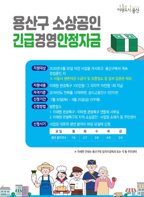 지원대상은 2020년 6월 30일 이전에 사업을 개시하고 신청일 현재 계속 영업 중인 자영업자(신규 창업 소상공인)와 2019년도 매출액이 10억원(영업기간 6개월 미만인 경우 5억원) 미만인 소상공인이다. 사업자등록증상 주된 사업장 소재지가 용산이어야 한다.
