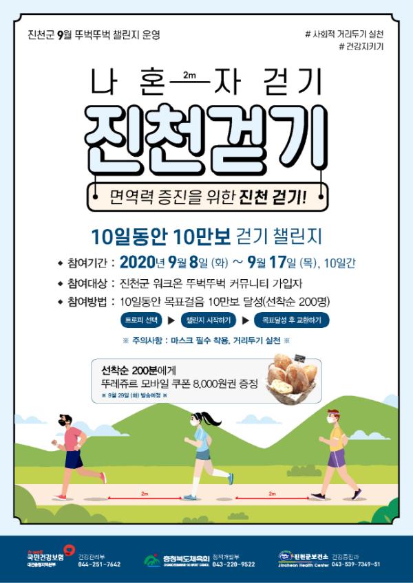 진천군이 비대면 건강생활실천 사업인 ‘뚜벅뚜벅 모바일 걷기 앱’ 챌린지를 지난 8월에 이어 9월에도 운영한다.
