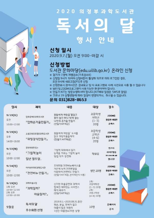 2020 의정부과학도서관 독서의 달 행사는 9월 7일 월요일 오전 9시부터 의정부시 도서관 문화마당 홈페이지에서 선착순 신청할 수 있으며, 참가비는 무료이다. 기타 자세한 사항은 도서관 홈페이지나 전화(031-828-8653)로 문의하면 된다.