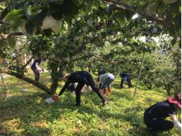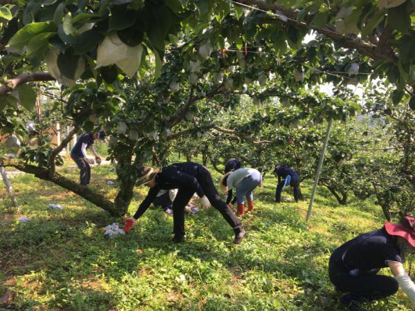 경남도청 직원들이 4일, 진주시 문산읍 옥산리 일대에서 제9호 태풍 ‘마이삭’으로 피해를 입은 배 재배 농가의 시름을 덜기 위해 낙과 배 줍기 등 과원 정리를 하며 농촌 일손 돕기에 나섰다.