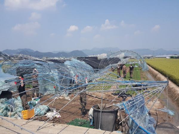 김해시는 제9호 태풍 ‘마이삭’의 여파로 피해를 입은 농가에 대하여 지난 4일 군부대와 합동으로 대민 지원에 나섰다.