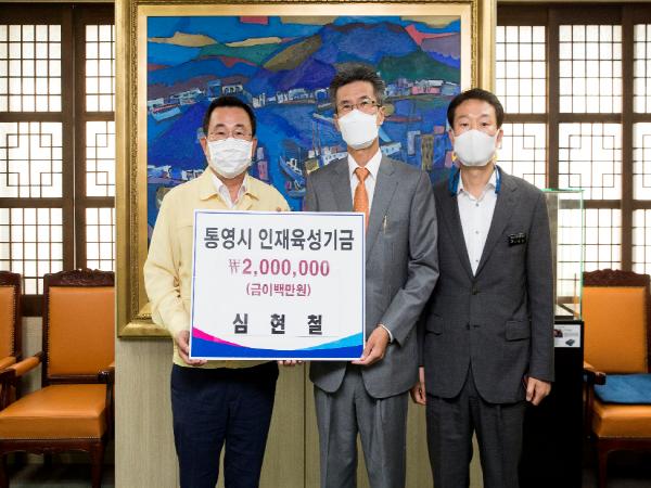 통영시는 9월 4일 시청에서 심현철 대표와 통영시의 미래 인재 육성을 위한 기금 200만원 기탁식을 가졌다.
