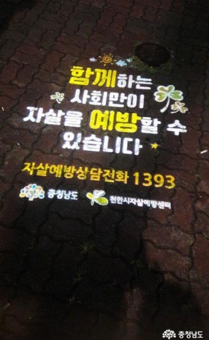 충남도는 충남자살예방센터와 함께 천안시 자살 빈번지역 5곳에 자살예방 로고젝터를 설치했다고 6일 밝혔다.