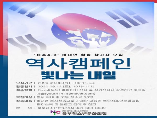 청소년운영위원회 ‘별’이 기획하여 운영하는 역사캠페인 활동은 코로나19로 인해 비대면 활동으로 진행되며 프로그램 내용은 △‘제주4?3’ 사건과 관련된 교육 영상 시청 △‘제주4?3’ 손 글씨 릴레이 캠페인 후 보고서 제출 등으로 구성된다.