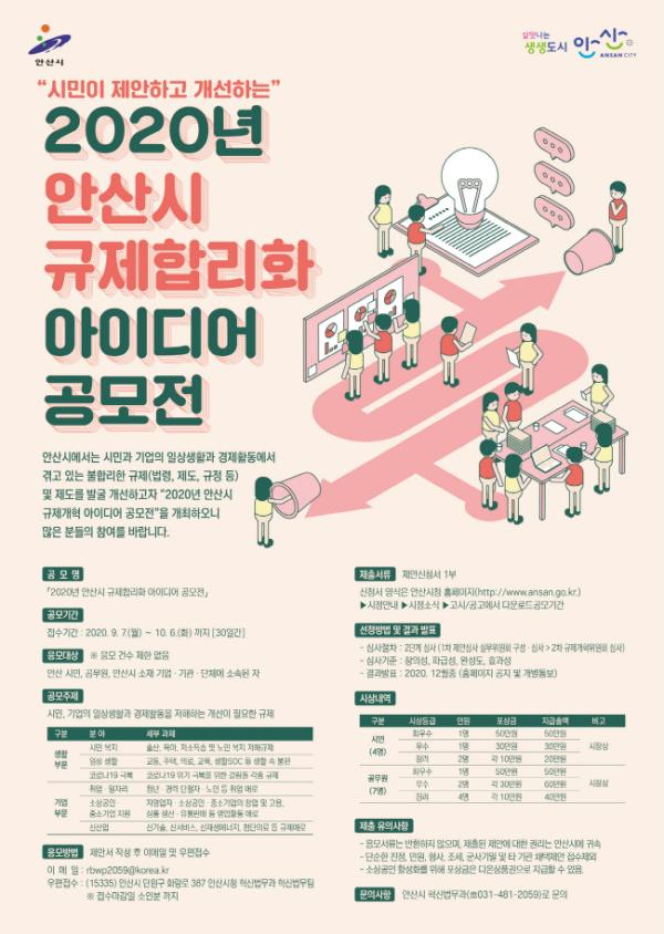 안산시(시장 윤화섭)는 코로나바이러스감염증-19(코로나19) 사태로 침체된 지역경제를 살리고, 시민의 일상생활과 기업 활동을 저해하는 불합리한 규제를 적극 개선하기 위해 ‘2020년 안산시 규제합리화 공모전’을 개최한다고 7일 밝혔다.