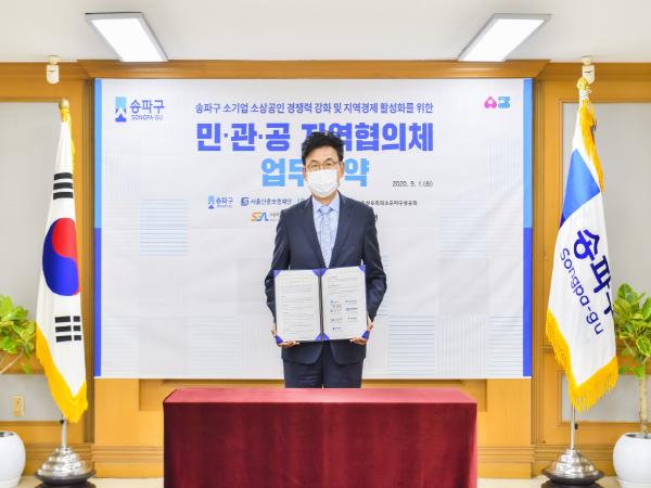 업무협약은 당초 송파구, 서울신용보증재단, 하나은행 등 각 기관의 대표 인사를 초대해 협약식을 개최할 예정이었으나, 강화된 ‘사회적 거리두기’ 2단계에 대응하여, 서면 방식으로 협약 체결을 완료했다.