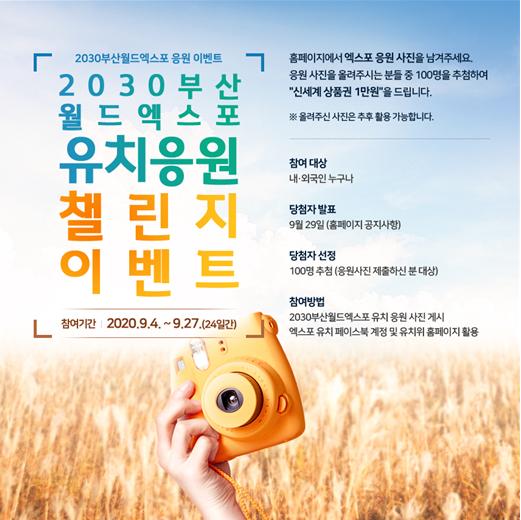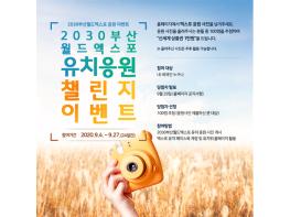 부산시(시장 권한대행 변성완)는 전 국민이 엑스포를 이해하고 관심을 가질 수 있도록 2030부산월드엑스포 범시민유치위원회와 함께 「2030부산월드엑스포 유치응원 챌린지」 온라인 이벤트를 개최한다고 밝혔다.