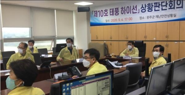 박성일 완주군수는 4일 오후 군청 5층 재난안전대책본부에서 ‘제19 태풍 하이선 대비 상황판단회의’를 개최하고 부서별 추진상황과 향후 대처계획 등을 점검했다.