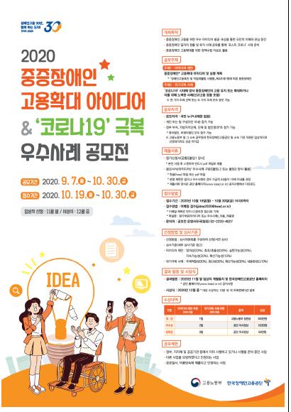 고용노동부(장관 이재갑)가 주최하고 한국장애인고용공단(이사장 조종란)이 주관하는 ‘2020 중증장애인 고용확대 아이디어 및 코로나19 극복 우수사례 공모전’이 9월 7일부터 10월 30일까지 개최된다.