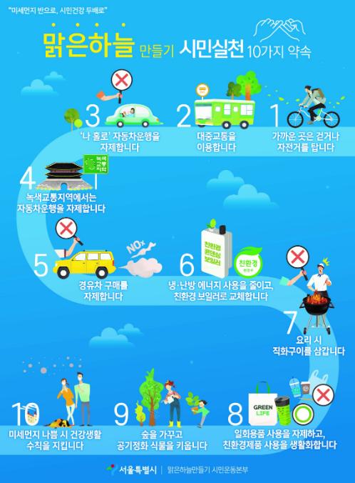 서울시는 이와 함께 시민들이 일상 속에서 미세먼지 저감을 위해 실천할 수 있는 10가지 실천방안을 시민들에게 당부했다. ‘맑은하늘만들기 시민실천 10가지 약속’은 △가까운 곳은 걷거나 자전거 타기 △대중교통 이용 △‘나 홀로’ 운행 자제 △녹색교통지역 자동차 운행 자제 △경유차 구매 자제 △냉·난방 에너지 절약 및 친환경 보일러 교체 △요리 시 직화구이 자제 △일회용품 사용 자제, 친환경제품 생활화 △숲 가꾸기 △미세먼지 나쁨 시 건강생활수칙 지키기 등이다.