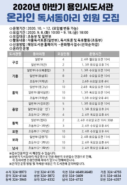 대상 도서관은 구성?기흥?흥덕?중앙?동백?모현?보라?남사 등 8곳이다. 한 동아리당 10명 내외로 구성되며 일반부 57명 초등부 50명을 모집해 36개 동아리를 운영할 방침이다.