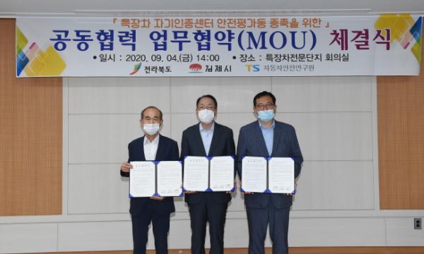 김제시(시장 박준배)는 지난 4일 백구 특장차 전문단지 관리사무소에서 특장차 자기인증센터 안전평가동 증축을 위해 전북도 및 ts 자동차안전연구원과 업무협약을 체결했다.