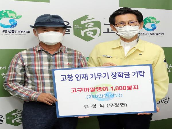황금터영농조합법인(대표 김정식)이 지난 4일 코로나19 극복 응원 고구마말랭이 1000봉지를 고창군장학재단에 기탁했다.