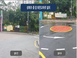 이에 구는 학교 측과 협의해 보도의 일부구간 폭을 조정하고 차량 회차공간을 확보해 회전교차로 1개를 설치했다.