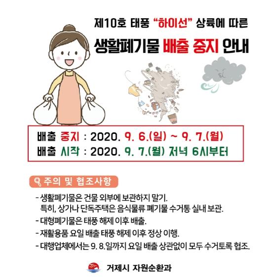 거제시는 제10호 태풍 하이선 북상으로 6일부터 7일 오전까지 시민들에게 폐기물 배출을 2일간 중지해 줄 것을 요청했다.