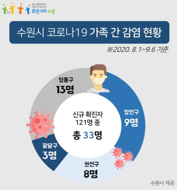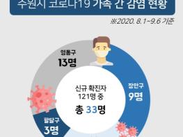 8월 1일부터 9월 6일까지 수원시에서 발생한 코로나19 확진자 121명 중 33명(27.3%)이 가족에게 감염된 것으로 파악됐다.