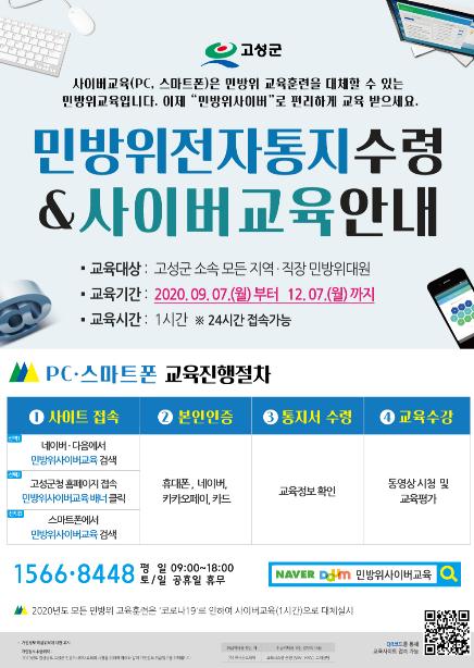 이번에 실시하는 민방위 사이버교육은 고성군에 주소를 둔 지역·직장민방위대원을 포함한 전 대원을 대상으로 하며, 스마트폰이나 PC를 이용하여 시간과 장소에 구애받지 않고 교육 이수가 가능하다.