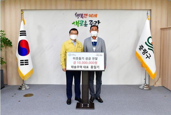 중랑구(구청장 류경기)는 8일 태솔주택(대표 홍일기)으로부터 이웃돕기 성금 1,000만 원을 기탁받았다고 밝혔다.