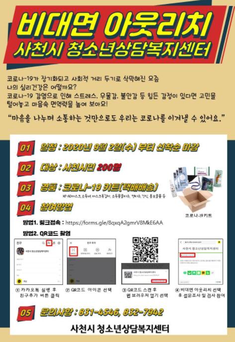 여성가족부에서 지원하고 사천시 청소년육성재단(이사장 최재원 부시장)이 운영하는 사천시 청소년상담복지센터는 9월 2일부터 200여 명의 시민을 대상으로 ‘비대면 아웃리치’를 진행한다고 전했다.