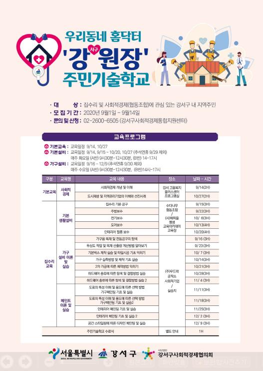 서울 강서구(구청장 노현송)는 집수리 전문기술 교육을 통해 주거관리 전문가를 양성하고자 ‘우리동네 홈닥터 강원장’을 모집한다고 밝혔다.
